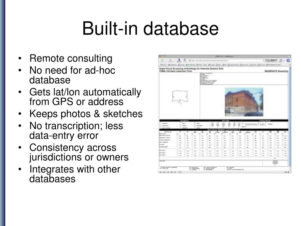 Built-in database • Remote consulting • No need for ad-hoc database • Gets lat/lon automatically from GPS or address • Keeps photos & sketches • No transcription; less data-entry error • Consistency across jurisdictions or owners • Integrates with other databases