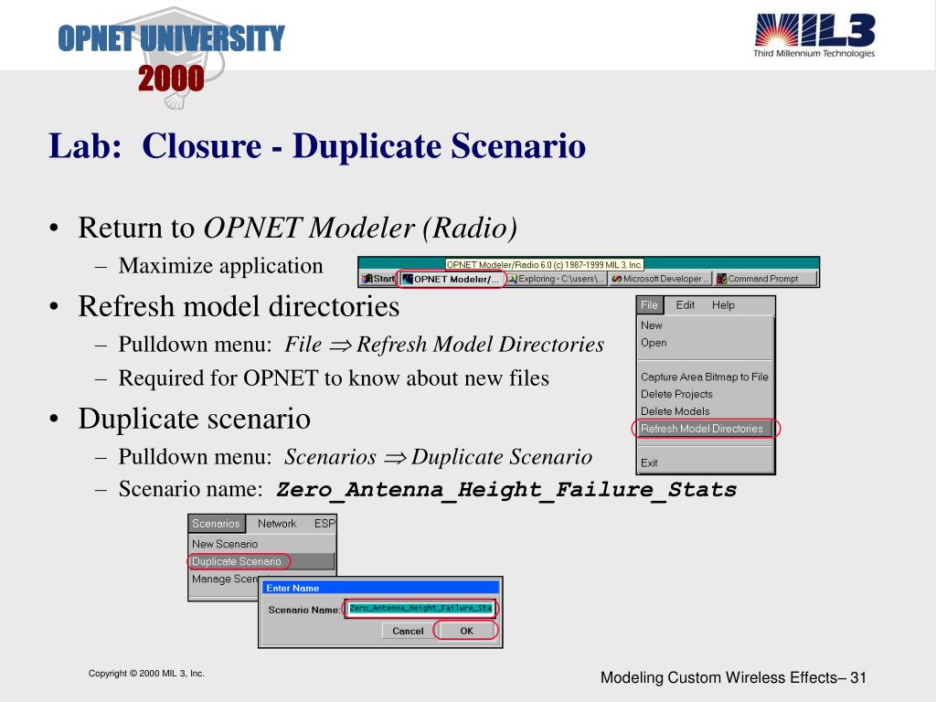 Lab: Closure - Duplicate Scenario • Return to OPNET Modeler (Radio) • Maximize application • Refresh model directories • Pulldown menu: File Refresh Model Directories • Required for OPNET to know about new files • Duplicate scenario • Pulldown menu: Scenarios Duplicate Scenario • Scenario name: Zero_Antenna_Height_Failure_Stats