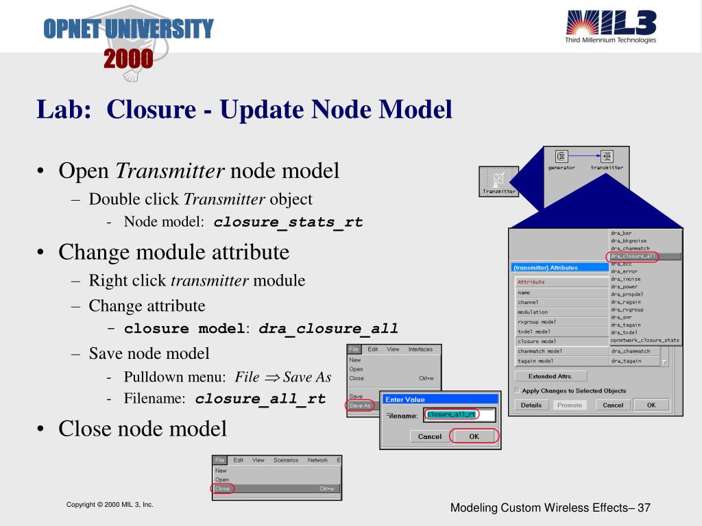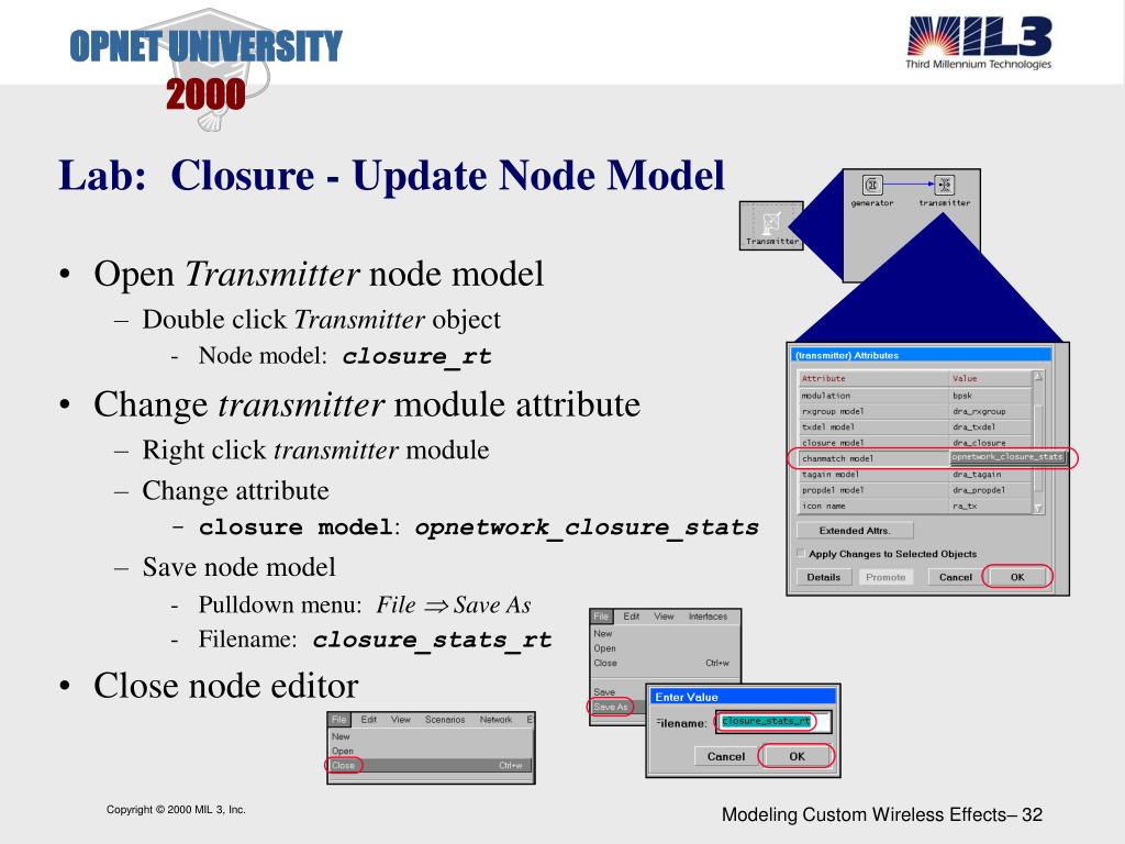 Lab: Closure - Update Node Model • Open Transmitter node model • Double click Transmitter object • Node model: closure_rt • Change transmitter module attribute • Right click transmitter module • Change attribute • closure model: opnetwork_closure_stats • Save node model • Pulldown menu: File Save As • Filename:closure_stats_rt • Close node editor