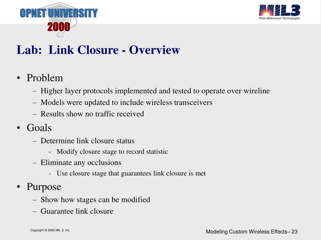 Lab: Link Closure - Overview • Problem • Higher layer protocols implemented and tested to operate over wireline • Models were updated to include wireless transceivers • Results show no traffic received • Goals • Determine link closure status • Modify closure stage to record statistic • Eliminate any occlusions • Use closure stage that guarantees link closure is met • Purpose • Show how stages can be modified • Guarantee link closure