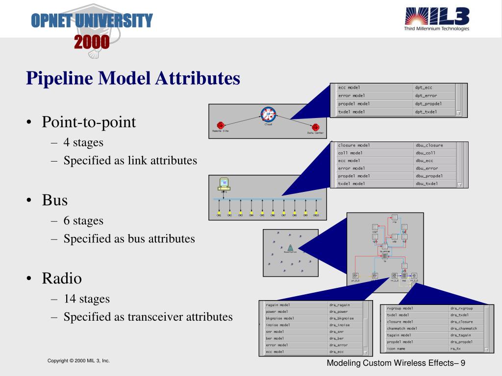 Pipeline Model Attributes • Point-to-point • 4 stages • Specified as link attributes • Bus • 6 stages • Specified as bus attributes • Radio • 14 stages • Specified as transceiver attributes