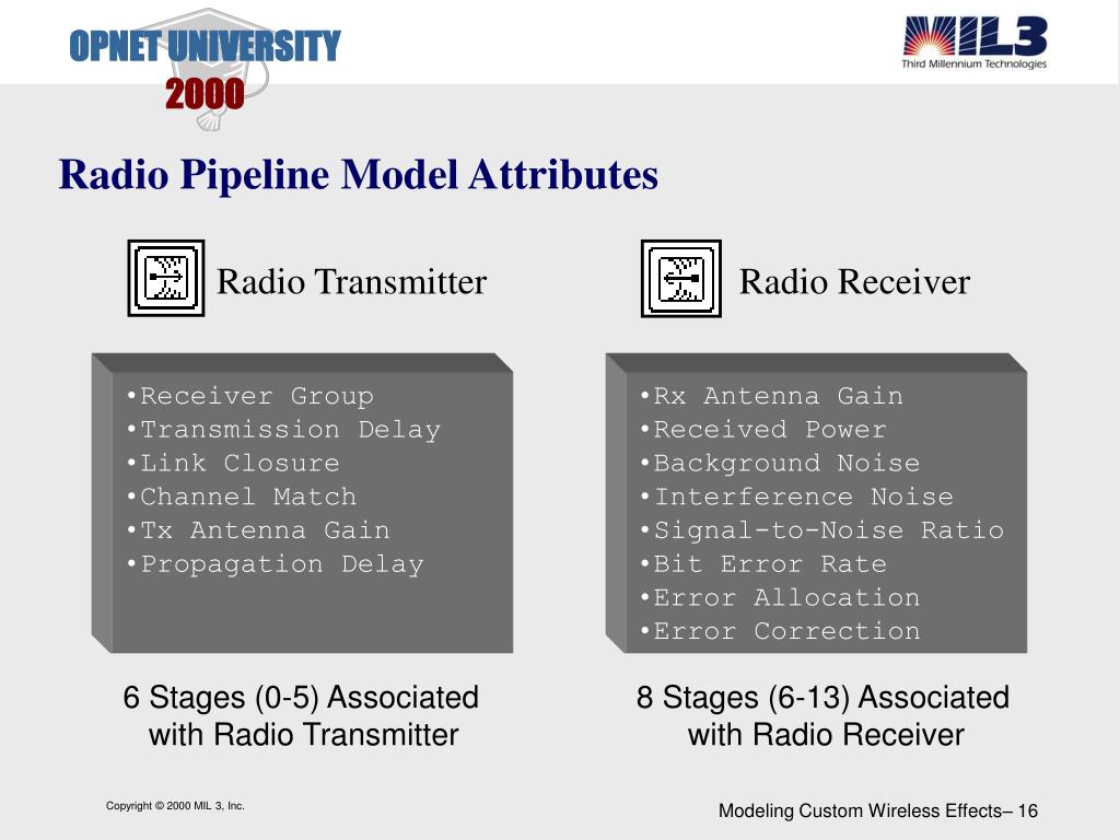 Goals • Introduce the OPNET Transceiver Pipeline • Capabilities • Defaults • Modify pipeline • Show openness and extensibility • Model custom wireless effects