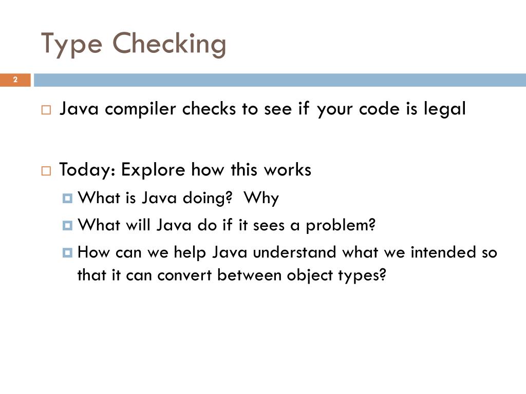 Type Checking • Java compiler checks to see if your code is legal • Today: Explore how this works • What is Java doing? Why • What will Java do if it sees a problem? • How can we help Java understand what we intended so that it can convert between object types?