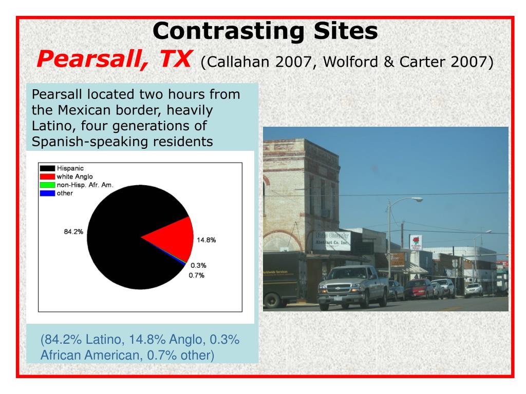 Contrasting Sites Pearsall, TX (Callahan 2007, Wolford & Carter 2007) Pearsall located two hours from the Mexican border, heavily Latino, four generations of Spanish-speaking residents (84.2% Latino, 14.8% Anglo, 0.3% African American, 0.7% other)