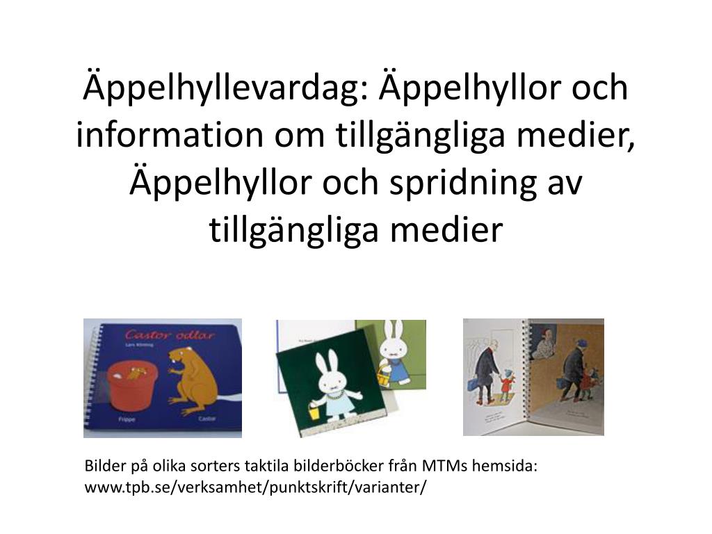 Äppelhyllevardag: Äppelhyllor och information om tillgängliga medier, Äppelhyllor och spridning av tillgängliga medier Bilder på olika sorters taktila bilderböcker från MTMs hemsida: www.tpb.se/verksamhet/punktskrift/varianter/