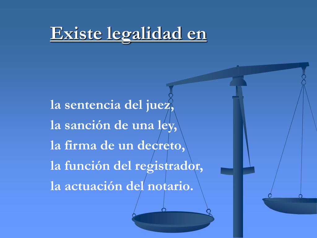 Existe legalidad en la sentencia del juez, la sanción de una ley, la firma de un decreto, la función del registrador, la actuación del notario.
