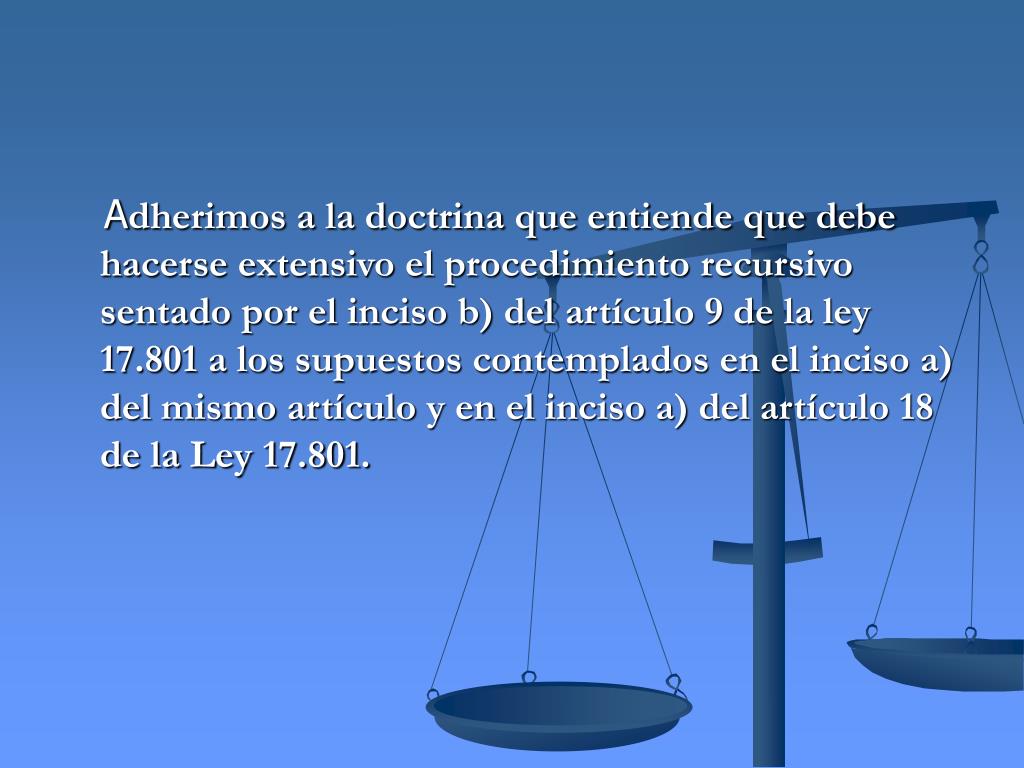 Adherimos a la doctrina que entiende que debe hacerse extensivo el procedimiento recursivo sentado por el inciso b) del artículo 9 de la ley 17.801 a los supuestos contemplados en el inciso a) del mismo artículo y en el inciso a) del artículo 18 de la Ley 17.801.