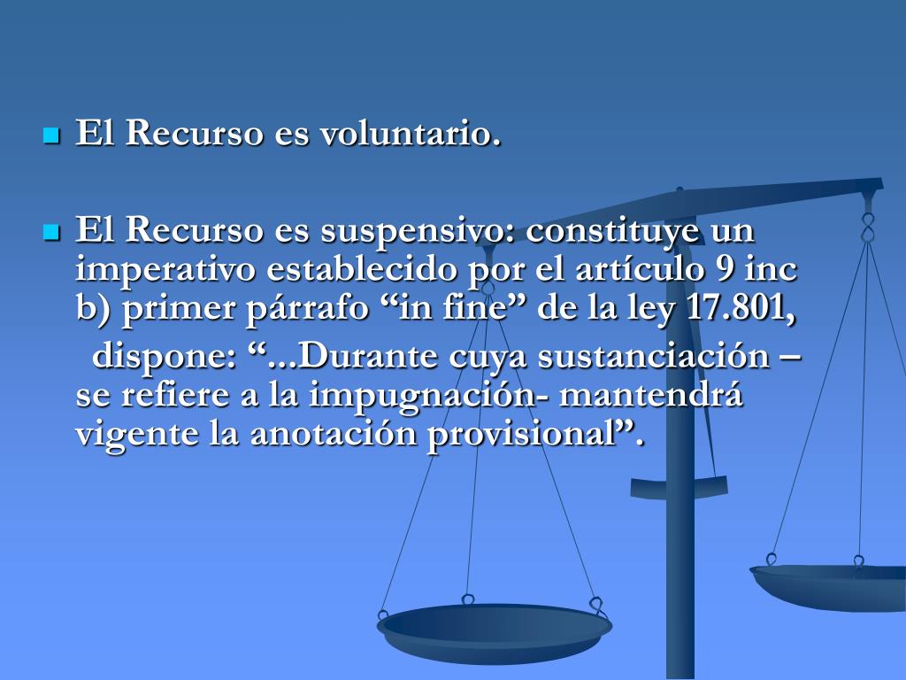 El Recurso es voluntario. • El Recurso es suspensivo: constituye un imperativo establecido por el artículo 9 inc b) primer párrafo “in fine” de la ley 17.801, dispone: “...Durante cuya sustanciación – se refiere a la impugnación- mantendrá vigente la anotación provisional”.