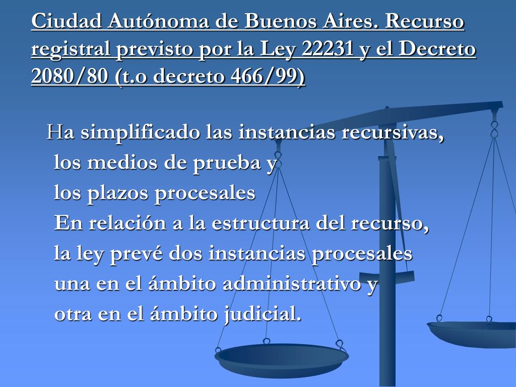 Ciudad Autónoma de Buenos Aires. Recurso registral previsto por la Ley 22231 y el Decreto 2080/80 (t.o decreto 466/99) Ha simplificado las instancias recursivas, los medios de prueba y los plazos procesales En relación a la estructura del recurso, la ley prevé dos instancias procesales una en el ámbito administrativo y otra en el ámbito judicial.