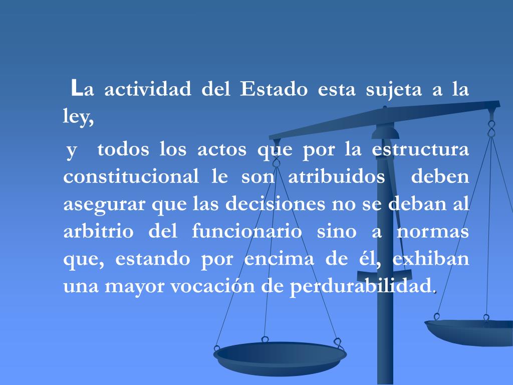 La actividad del Estado esta sujeta a la ley, y todos los actos que por la estructura constitucional le son atribuidos deben asegurar que las decisiones no se deban al arbitrio del funcionario sino a normas que, estando por encima de él, exhiban una mayor vocación de perdurabilidad.