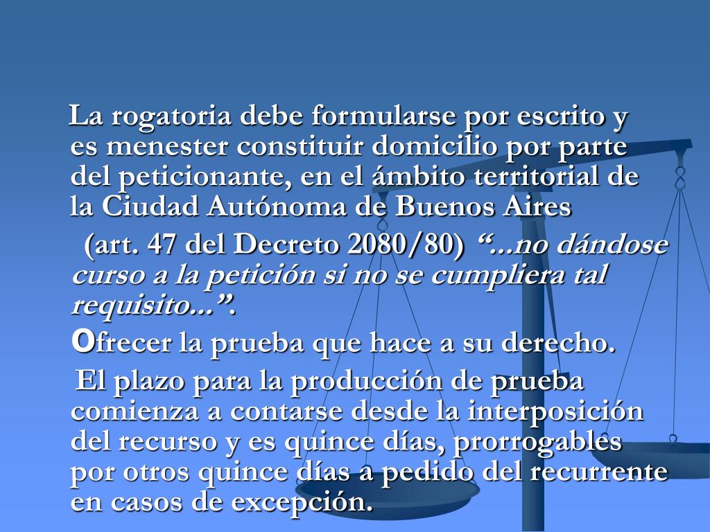 La rogatoria debe formularse por escrito y es menester constituir domicilio por parte del peticionante, en el ámbito territorial de la Ciudad Autónoma de Buenos Aires (art. 47 del Decreto 2080/80) “...no dándose curso a la petición si no se cumpliera tal requisito...”. Ofrecer la prueba que hace a su derecho. El plazo para la producción de prueba comienza a contarse desde la interposición del recurso y es quince días, prorrogables por otros quince días a pedido del recurrente en casos de excepción.