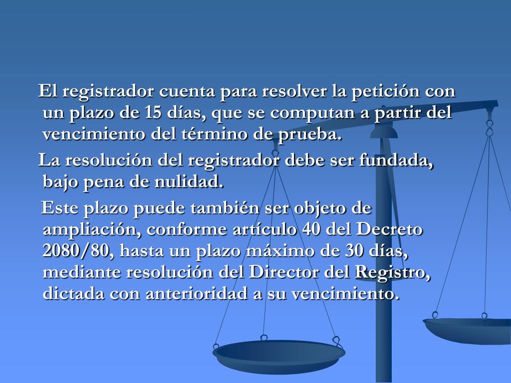 El registrador cuenta para resolver la petición con un plazo de 15 días, que se computan a partir del vencimiento del término de prueba. La resolución del registrador debe ser fundada, bajo pena de nulidad. Este plazo puede también ser objeto de ampliación, conforme artículo 40 del Decreto 2080/80, hasta un plazo máximo de 30 días, mediante resolución del Director del Registro, dictada con anterioridad a su vencimiento.