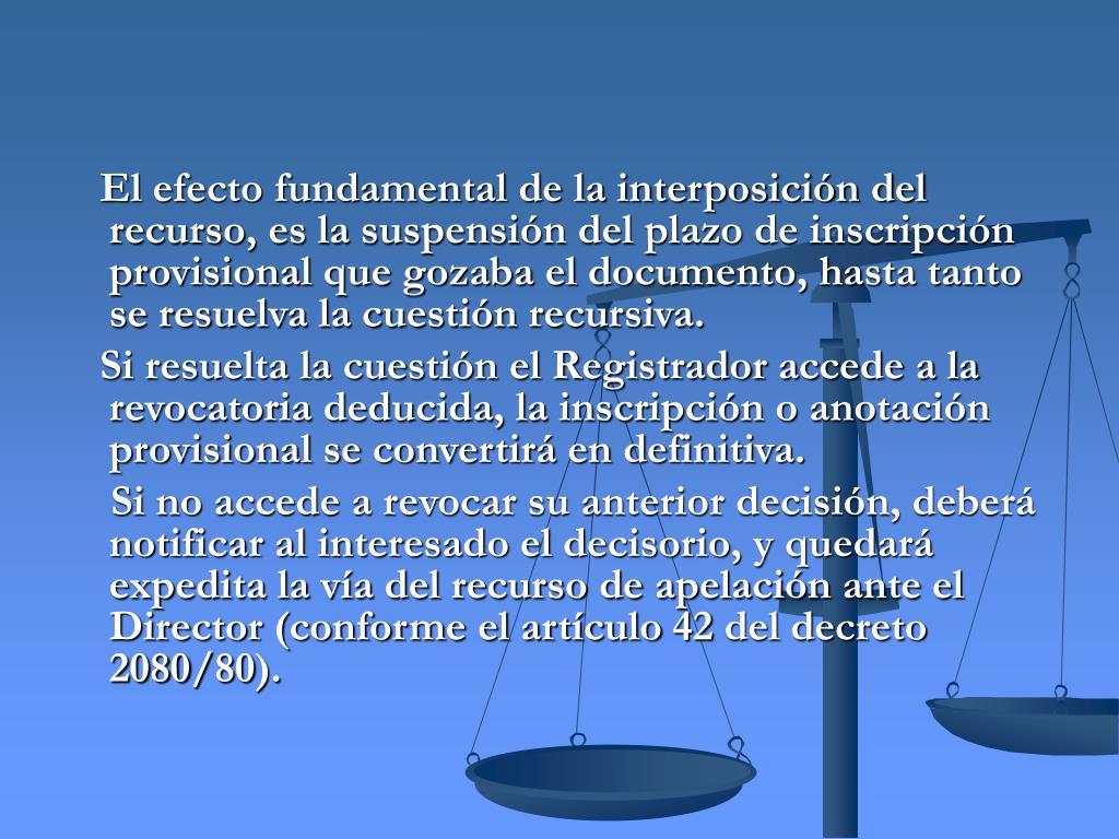 El efecto fundamental de la interposición del recurso, es la suspensión del plazo de inscripción provisional que gozaba el documento, hasta tanto se resuelva la cuestión recursiva. Si resuelta la cuestión el Registrador accede a la revocatoria deducida, la inscripción o anotación provisional se convertirá en definitiva. Si no accede a revocar su anterior decisión, deberá notificar al interesado el decisorio, y quedará expedita la vía del recurso de apelación ante el Director (conforme el artículo 42 del decreto 2080/80).