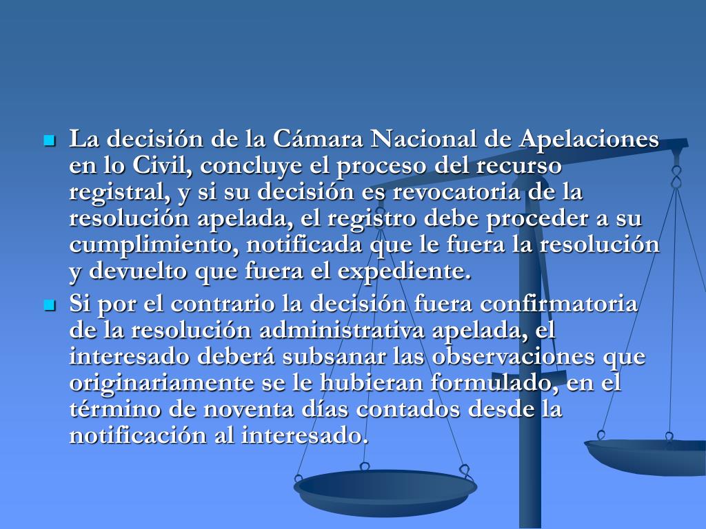 La decisión de la Cámara Nacional de Apelaciones en lo Civil, concluye el proceso del recurso registral, y si su decisión es revocatoria de la resolución apelada, el registro debe proceder a su cumplimiento, notificada que le fuera la resolución y devuelto que fuera el expediente. • Si por el contrario la decisión fuera confirmatoria de la resolución administrativa apelada, el interesado deberá subsanar las observaciones que originariamente se le hubieran formulado, en el término de noventa días contados desde la notificación al interesado.