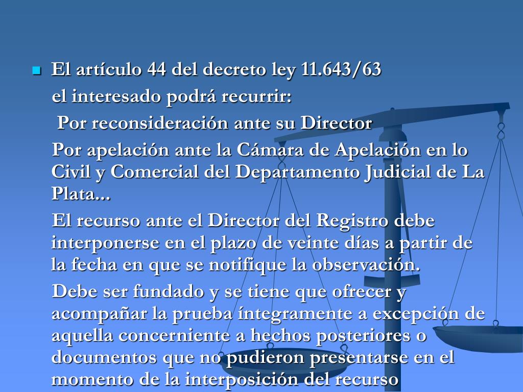 El artículo 44 del decreto ley 11.643/63 el interesado podrá recurrir: Por reconsideración ante su Director Por apelación ante la Cámara de Apelación en lo Civil y Comercial del Departamento Judicial de La Plata... El recurso ante el Director del Registro debe interponerse en el plazo de veinte días a partir de la fecha en que se notifique la observación. Debe ser fundado y se tiene que ofrecer y acompañar la prueba íntegramente a excepción de aquella concerniente a hechos posteriores o documentos que no pudieron presentarse en el momento de la interposición del recurso