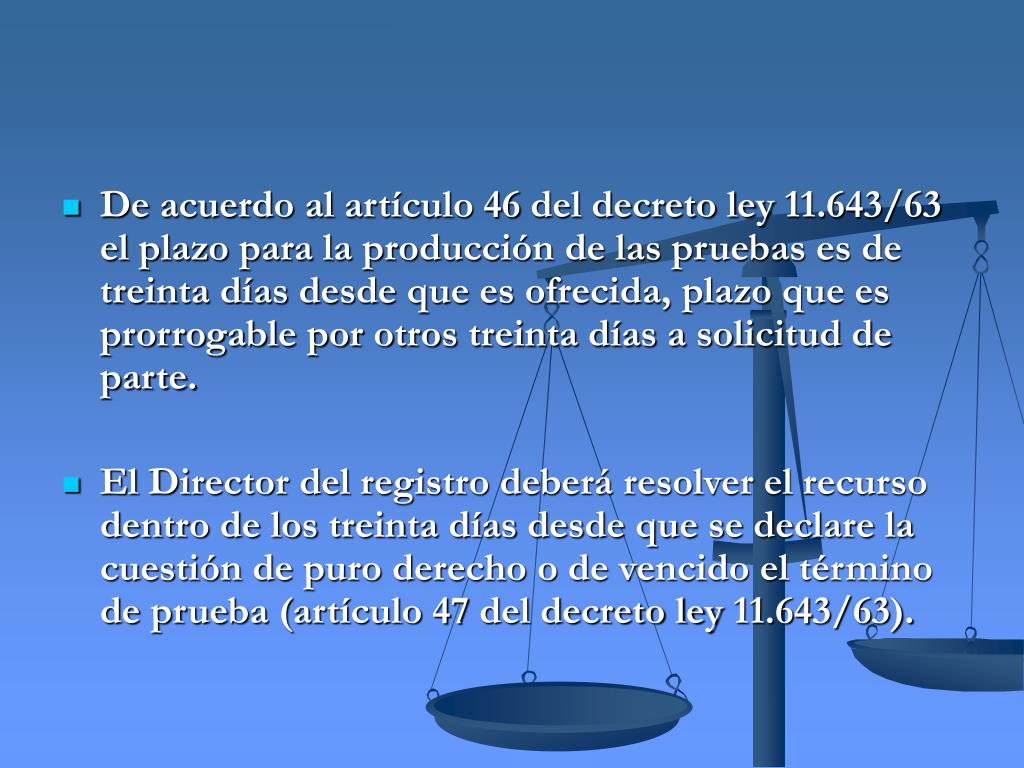 De acuerdo al artículo 46 del decreto ley 11.643/63 el plazo para la producción de las pruebas es de treinta días desde que es ofrecida, plazo que es prorrogable por otros treinta días a solicitud de parte. • El Director del registro deberá resolver el recurso dentro de los treinta días desde que se declare la cuestión de puro derecho o de vencido el término de prueba (artículo 47 del decreto ley 11.643/63).