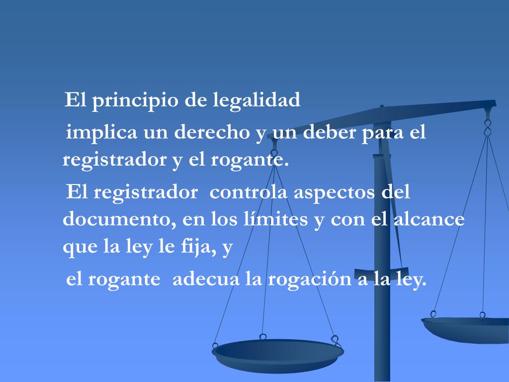 El principio de legalidad implica un derecho y un deber para el registrador y el rogante. El registrador controla aspectos del documento, en los límites y con el alcance que la ley le fija, y el rogante adecua la rogación a la ley.