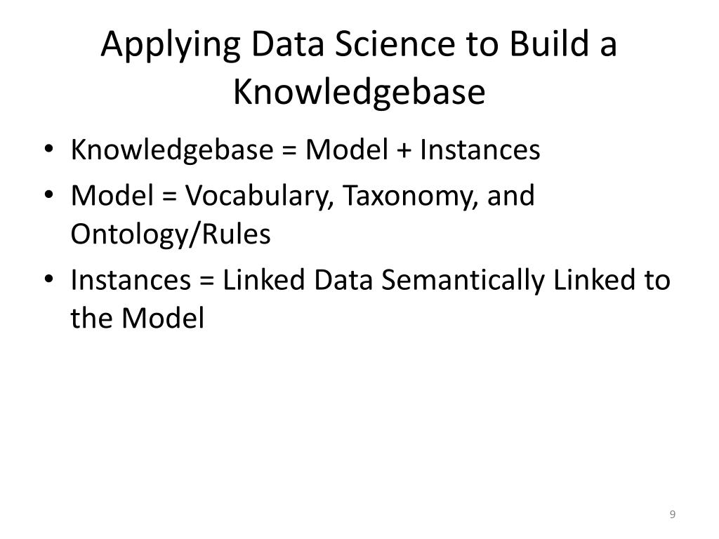 Applying Data Science to Build a Knowledgebase • Knowledgebase = Model + Instances • Model = Vocabulary, Taxonomy, and Ontology/Rules • Instances = Linked Data Semantically Linked to the Model