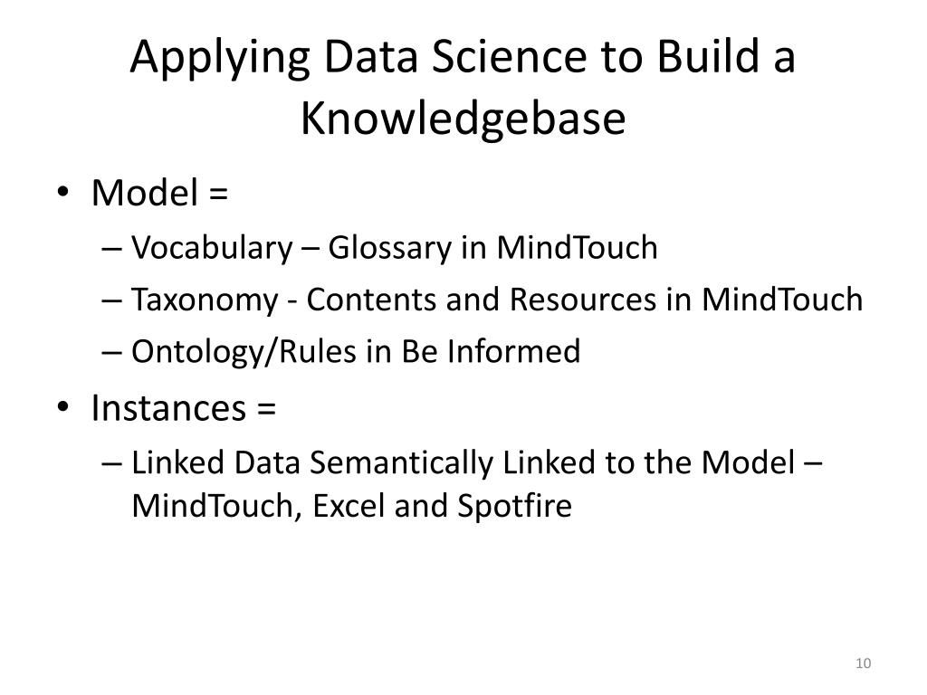 Applying Data Science to Build a Knowledgebase • Model = • Vocabulary – Glossary in MindTouch • Taxonomy - Contents and Resources in MindTouch • Ontology/Rules in Be Informed • Instances = • Linked Data Semantically Linked to the Model – MindTouch, Excel and Spotfire