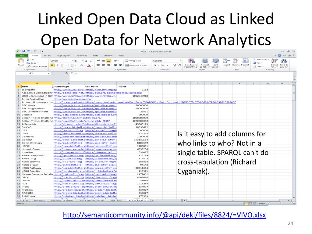 Linked Open Data Cloud as Linked Open Data for Network Analytics Is it easy to add columns for who links to who? Not in a single table. SPARQL can't do cross-tabulation (Richard Cyganiak). http://semanticommunity.info/@api/deki/files/8824/=VIVO.xlsx