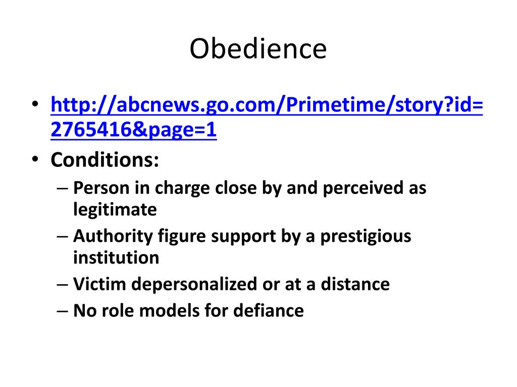 Obedience • http://abcnews.go.com/Primetime/story?id=2765416&page=1 • Conditions: • Person in charge close by and perceived as legitimate • Authority figure support by a prestigious institution • Victim depersonalized or at a distance • No role models for defiance
