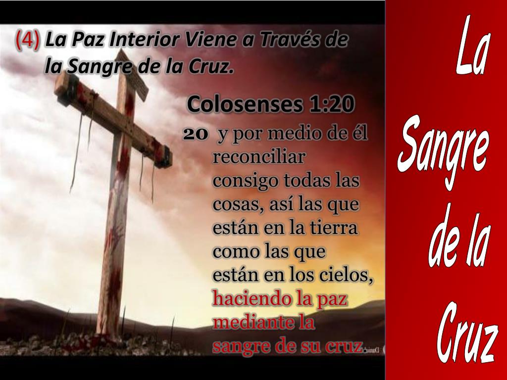 La Sangre de la Cruz (4) La Paz Interior Viene a Través de la Sangre de la Cruz. Colosenses 1:20 20 y por medio de él reconciliar consigo todas las cosas, así las que están en la tierra como las que están en los cielos, haciendo la paz mediante la sangre de su cruz.