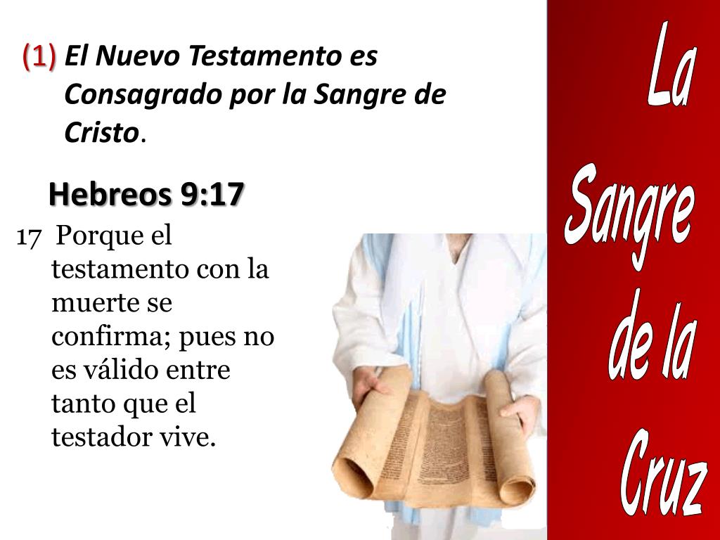 La Sangre de la Cruz (1) El Nuevo Testamento es Consagrado por la Sangre de Cristo. Hebreos 9:17 17 Porque el testamento con la muerte se confirma; pues no es válido entre tanto que el testador vive.