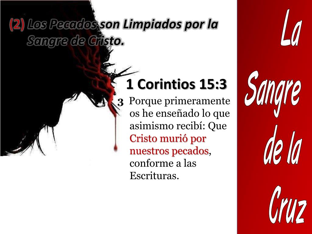 La Sangre de la Cruz (2) Los Pecados son Limpiados por la Sangre de Cristo. 1 Corintios 15:3 3 Porque primeramente os he enseñado lo que asimismo recibí: Que Cristo murió por nuestros pecados, conforme a las Escrituras.