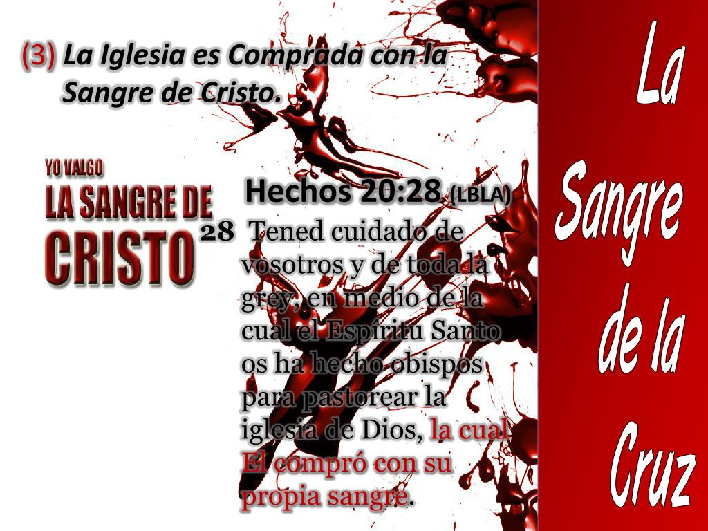 La Sangre de la Cruz (3) La Iglesia es Comprada con la Sangre de Cristo. Hechos 20:28 (LBLA) 28 Tened cuidado de vosotros y de toda la grey, en medio de la cual el Espíritu Santo os ha hecho obispos para pastorear la iglesia de Dios, la cual El compró con su propia sangre.