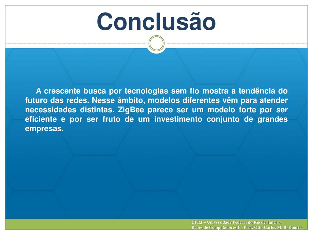Conclusão A crescente busca por tecnologias sem fio mostra a tendência do futuro das redes. Nesse âmbito, modelos diferentes vêm para atender necessidades distintas. ZigBee parece ser um modelo forte por ser eficiente e por ser fruto de um investimento conjunto de grandes empresas. UFRJ – Universidade Federal do Rio de Janeiro Redes de Computadores I – Prof. Otto Carlos M. B. Duarte