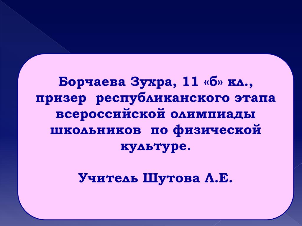 БорчаеваЗухра, 11 «б» кл., призер муниципального этапа всероссийской олимпиады школьников по физической культуре. Учитель Шутова Л.Е.