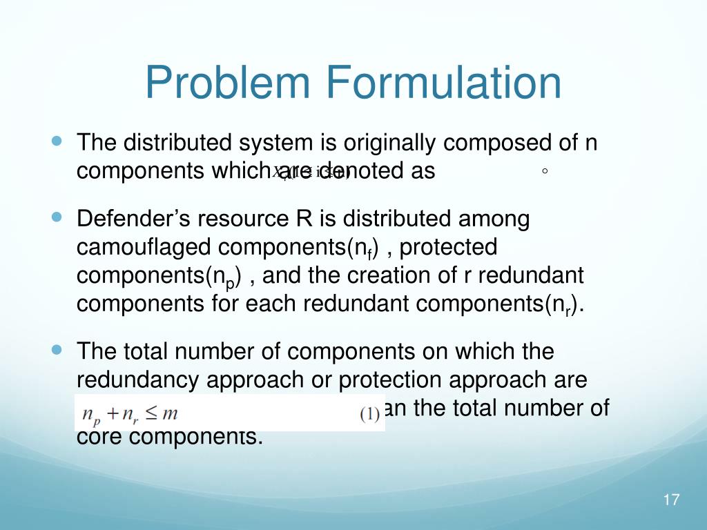 Problem Formulation • The distributed system is originally composed of n components which are denoted as 。 • Defender’s resource R is distributed among camouflaged components(nf), protected components(np) , and the creation of r redundant components for each redundant components(nr). • The total number of components on which the redundancy approach or protection approach are applied should be no more than the total number of core components.