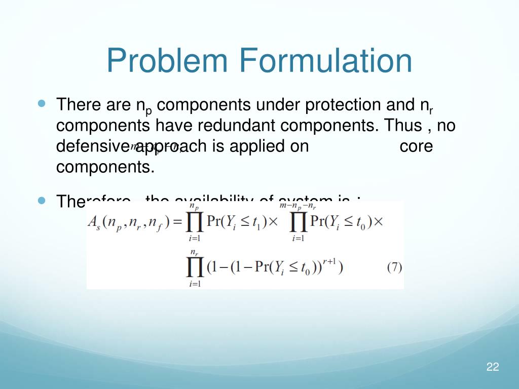 Problem Formulation • There are np components under protection and nrcomponents have redundant components. Thus , no defensive approach is applied on core components. • Therefore , the availability of system is: