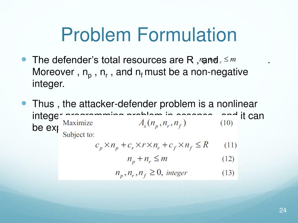 Problem Formulation • The defender’s total resources are R , and . Moreover , np , nr , and nfmust be a non-negative integer. • Thus , the attacker-defender problem is a nonlinear integer programming problem in essence , and it can be expressed as: