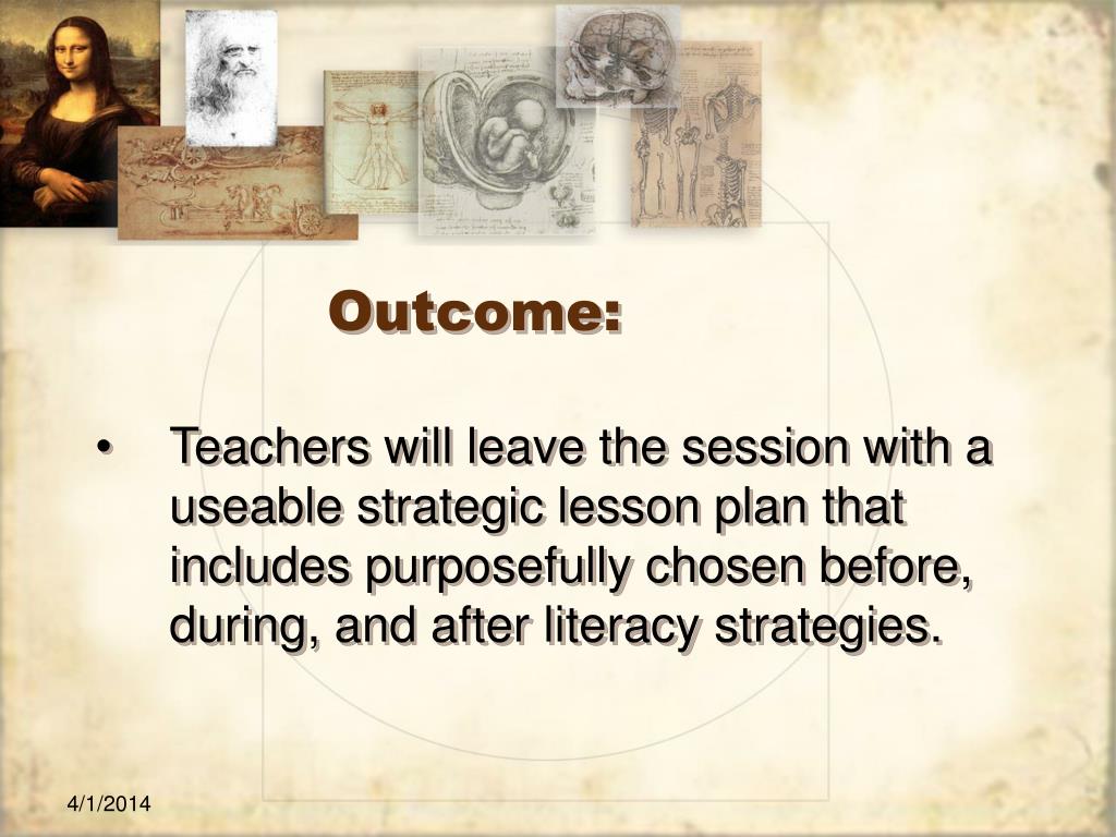 Outcome: • Teachers will leave the session with a useable strategic lesson plan that includes purposefully chosen before, during, and after literacy strategies.