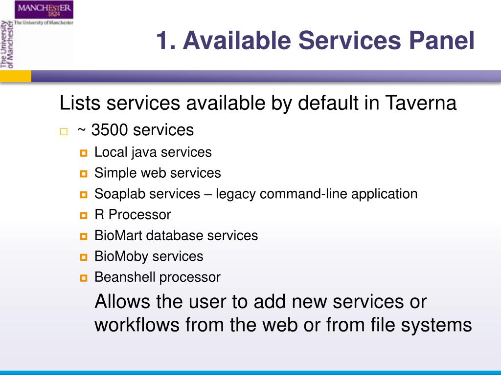 1. Available Services Panel Lists services available by default in Taverna • ~ 3500 services • Local java services • Simple web services • Soaplab services – legacy command-line application • R Processor • BioMart database services • BioMoby services • Beanshell processor Allows the user to add new services or workflows from the web or from file systems