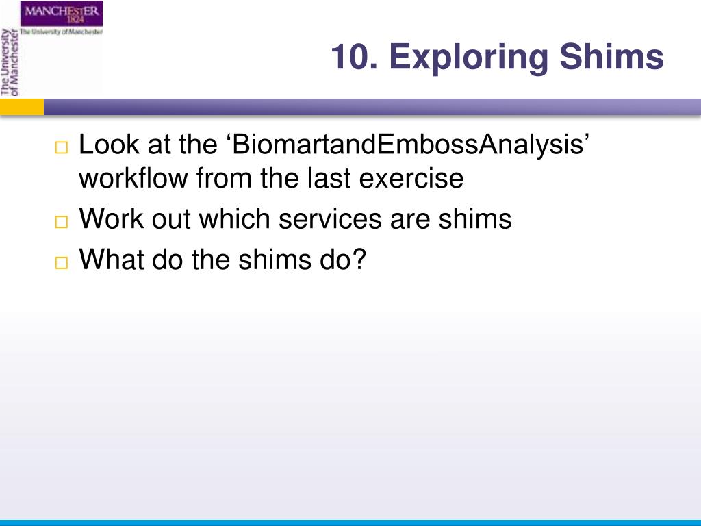 10. Exploring Shims Look at the ‘BiomartandEmbossAnalysis’ workflow from the last exercise Work out which services are shims What do the shims do?