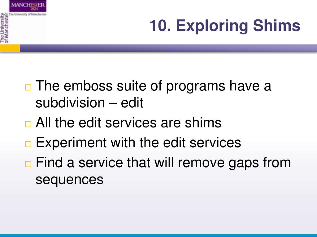 The emboss suite of programs have a subdivision – edit All the edit services are shims Experiment with the edit services Find a service that will remove gaps from sequences 10. Exploring Shims
