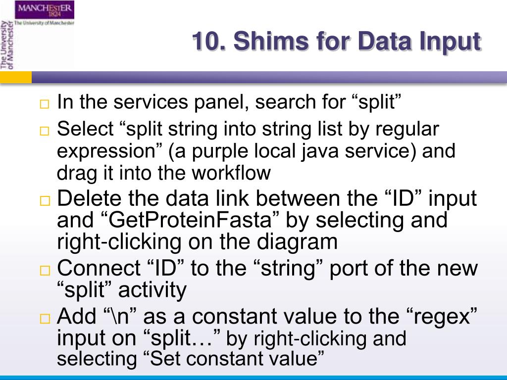 Exercise 10: Shims for Data Input Reload the ‘Blast’ workflow we built earlier So far, we have only added a few input values to our workflows. Normally, you would have a much larger data set. The “GetProteinFasta” activity can only handle one ID at a time. You can add more manually by adding multiple values into the input window (as we have already seen), but if you have a whole file, this is not ideal. Instead, we need an extra service to split a list of data items into individual values