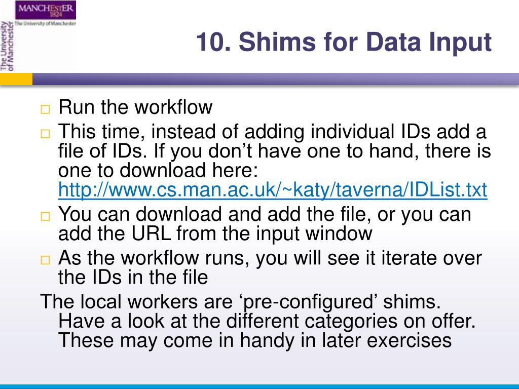 Run the workflow This time, instead of adding individual IDs add a file of IDs. If you don’t have one to hand, there is one to download here: http://www.cs.man.ac.uk/~katy/taverna/IDList.txt You can download and add the file, or you can add the URL from the input window As the workflow runs, you will see it iterate over the IDs in the file The local workers are ‘pre-configured’ shims. Have a look at the different categories on offer. These may come in handy in later exercises 10. Shims for Data Input