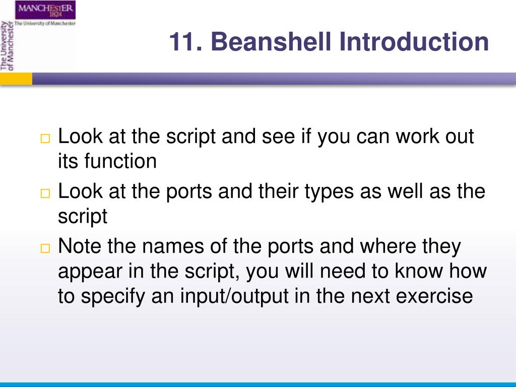 11. Beanshell Introduction Look at the script and see if you can work out its function Look at the ports and their types as well as the script Note the names of the ports and where they appear in the script, you will need to know how to specify an input/output in the next exercise