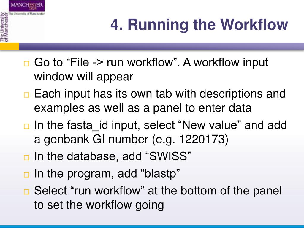 4. Running the Workflow Go to “File -> run workflow”. A workflow input window will appear Each input has its own tab with descriptions and examples as well as a panel to enter data In the fasta_id input, select “New value” and add a genbank GI number (e.g. 1220173) In the database, add “SWISS” In the program, add “blastp” Select “run workflow” at the bottom of the panel to set the workflow going