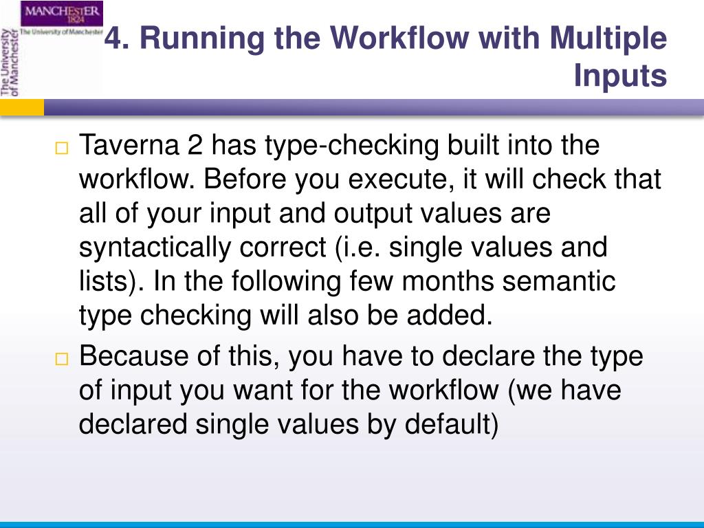 4. Running the Workflow with Multiple Inputs Taverna 2 has type-checking built into the workflow. Before you execute, it will check that all of your input and output values are syntactically correct (i.e. single values and lists). In the following few months semantic type checking will also be added. Because of this, you have to declare the type of input you want for the workflow (we have declared single values by default)