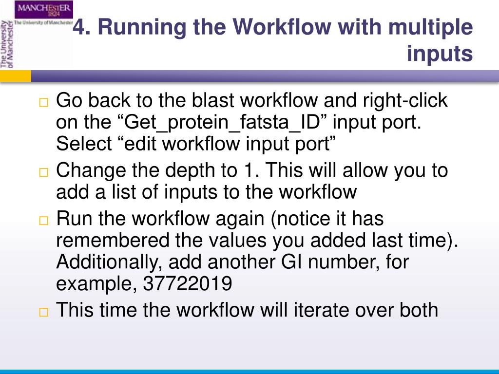 4. Running the Workflow with multiple inputs Go back to the blast workflow and right-click on the “Get_protein_fatsta_ID” input port. Select “edit workflow input port” Change the depth to 1. This will allow you to add a list of inputs to the workflow Run the workflow again (notice it has remembered the values you added last time). Additionally, add another GI number, for example, 37722019 This time the workflow will iterate over both