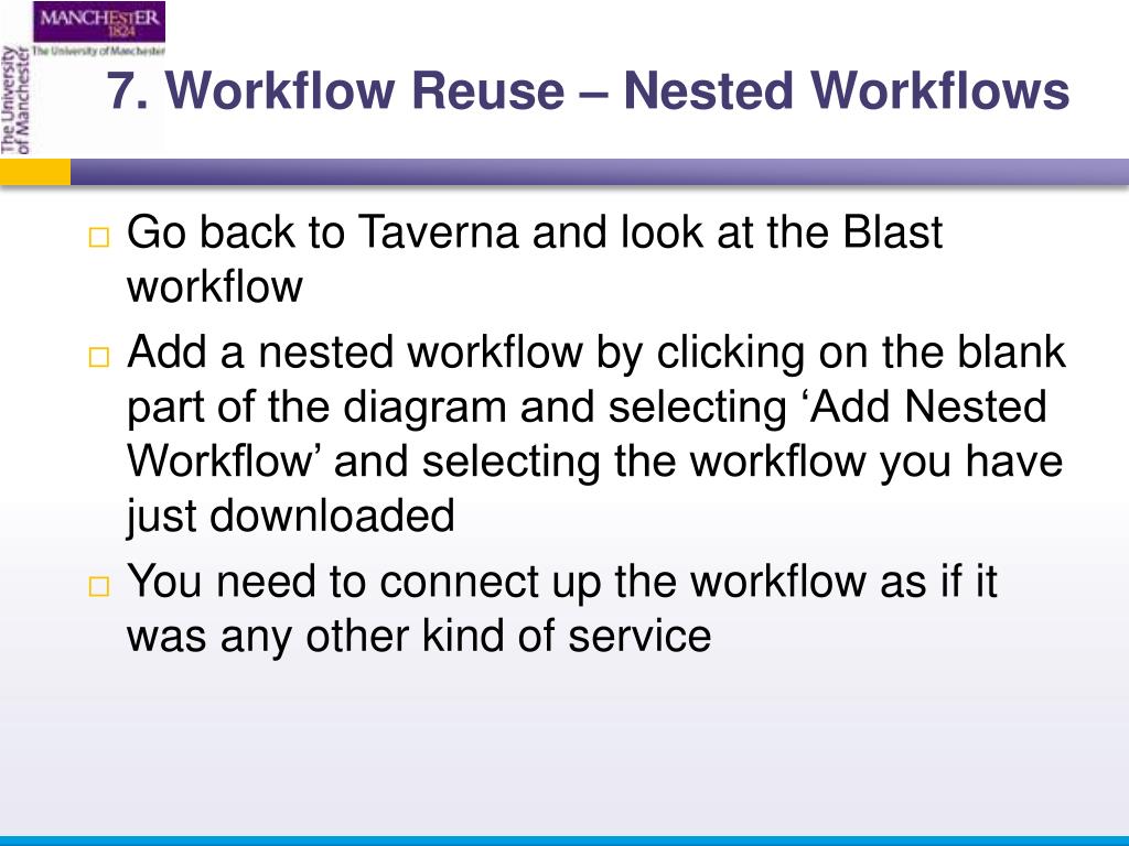 7. Workflow Reuse – Nested Workflows Go back to Taverna and look at the Blast workflow Add a nested workflow by clicking on the blank part of the diagram and selecting ‘Add Nested Workflow’ and selecting the workflow you have just downloaded You need to connect up the workflow as if it was any other kind of service