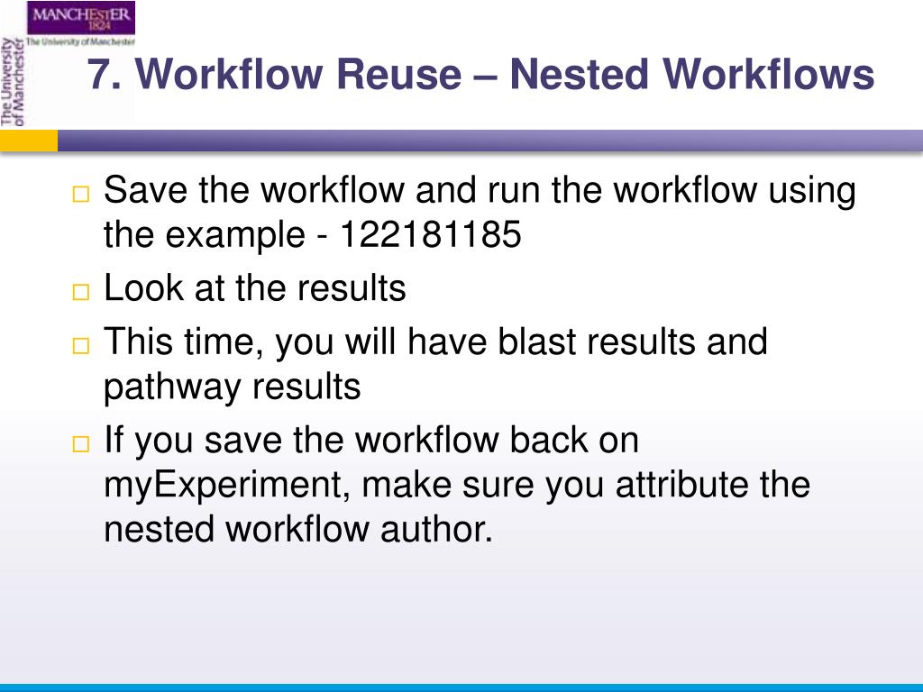 7. Workflow Reuse – Nested Workflows Save the workflow and run the workflow using the example - 122181185 Look at the results This time, you will have blast results and pathway results If you save the workflow back on myExperiment, make sure you attribute the nested workflow author.