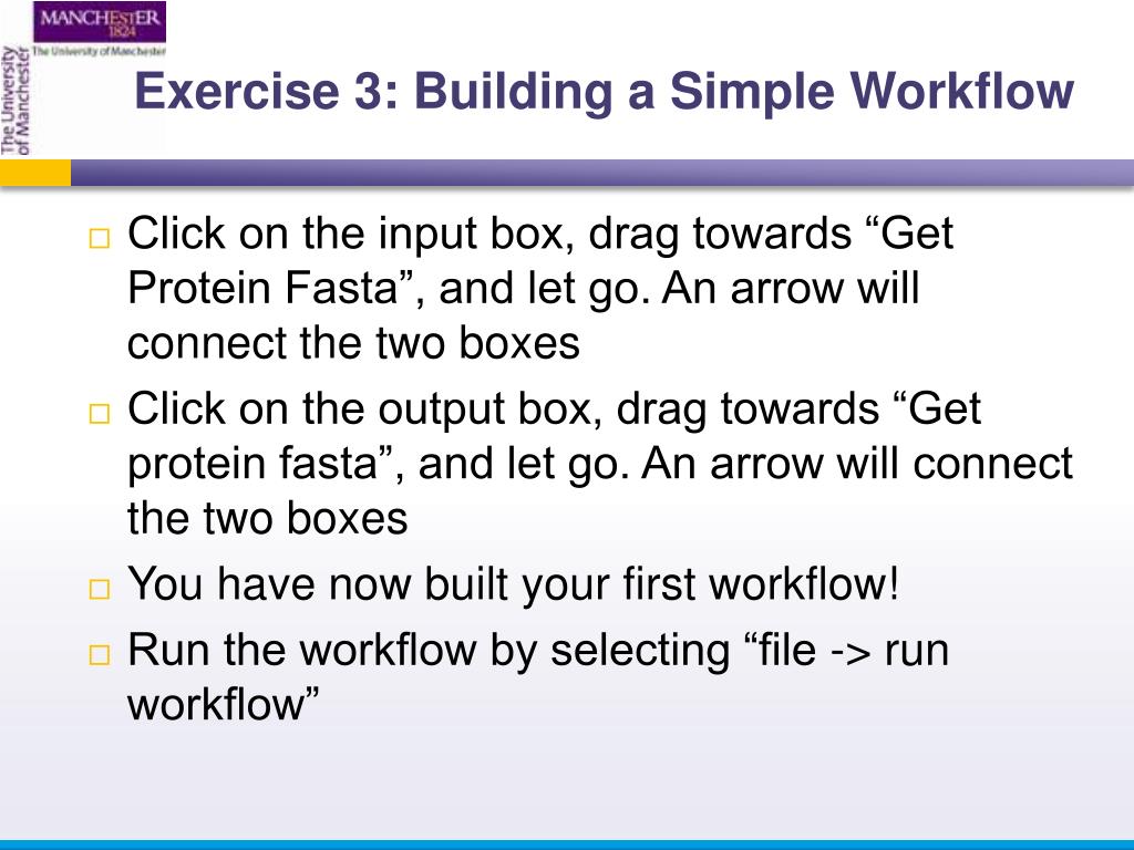 Exercise 3: Building a Simple Workflow Click on the input box, drag towards “Get Protein Fasta”, and let go. An arrow will connect the two boxes Click on the output box, drag towards “Get protein fasta”, and let go. An arrow will connect the two boxes You have now built your first workflow! Run the workflow by selecting “file -> run workflow”