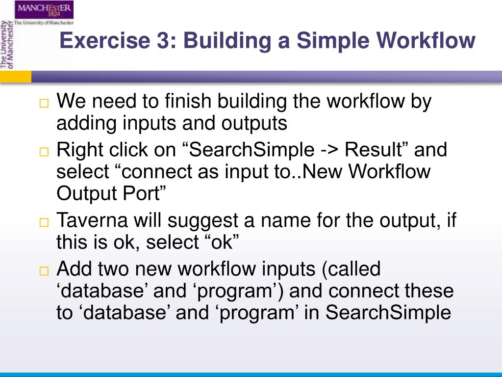 Exercise 3: Building a Simple Workflow We need to finish building the workflow by adding inputs and outputs Right click on “SearchSimple -> Result” and select “connect as input to..New Workflow Output Port” Taverna will suggest a name for the output, if this is ok, select “ok” Add two new workflow inputs (called ‘database’ and ‘program’) and connect these to ‘database’ and ‘program’ in SearchSimple