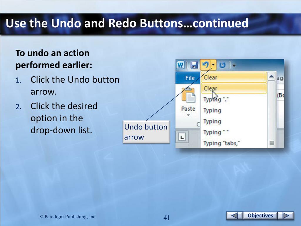 Use the Undo and Redo Buttons…continued To undo an action performed earlier: • Click the Undo button arrow. • Click the desired option in the drop-down list. Undo button arrow