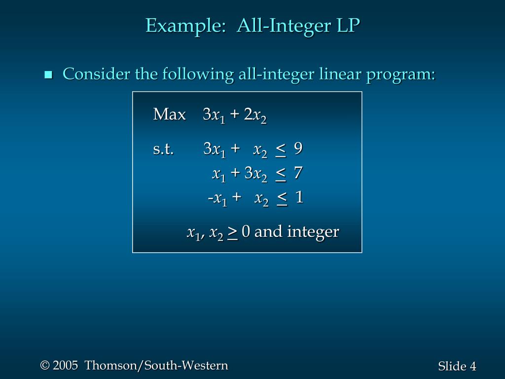 Example: All-Integer LP • Consider the following all-integer linear program: Max 3x1 + 2x2 s.t. 3x1 + x2< 9 x1 + 3x2< 7 -x1 + x2< 1 x1, x2> 0 and integer